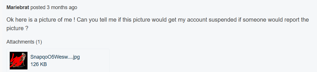 hi @Mariebrat and to answer your Q, yes because General Audience is for ages 14 and up, and the photo isn't something suitable for minors, and as far as I know, imvu's only adult photo area is in the AP forums where we can post pics like this.