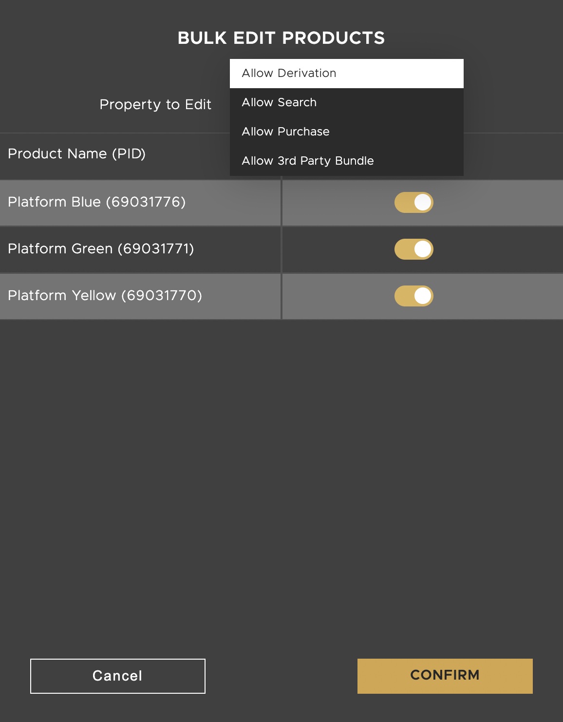 For any of your published products, you can now update the publishing properties on many products at the same time (Derivable, Searchable, Display Only, Allow in Bundles). Changes will take place immediately and you don’t need to republish your product anymore!