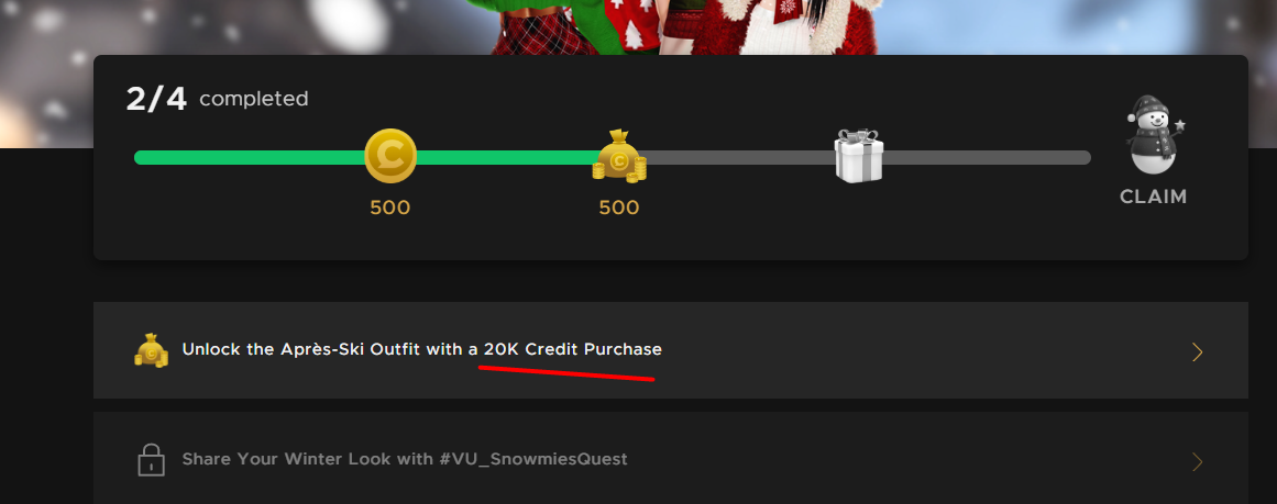 I didn't like how we needed to pull out our wallets to complete this quest, especially if we already have plenty of credits. I do appreciate how the sale was about 50% off at least, that's pretty cool. I just hope that if someone needed to buy credits in order to complete the 2 purchase parts before (gifting wishlist items and buying items for yourself), that they wouldn't have to buy credits again to complete this.