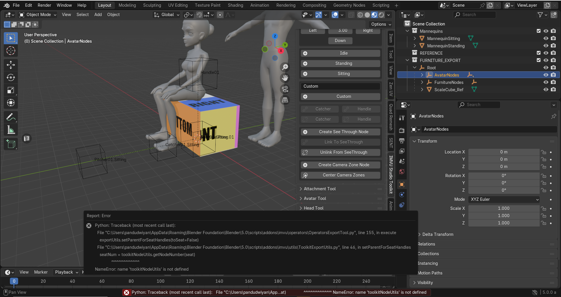 Does anyone know why this happens? Every time I add a standing or sitting animation, it won’t export. I also tried it in Blender 4.5 and it’s the same.