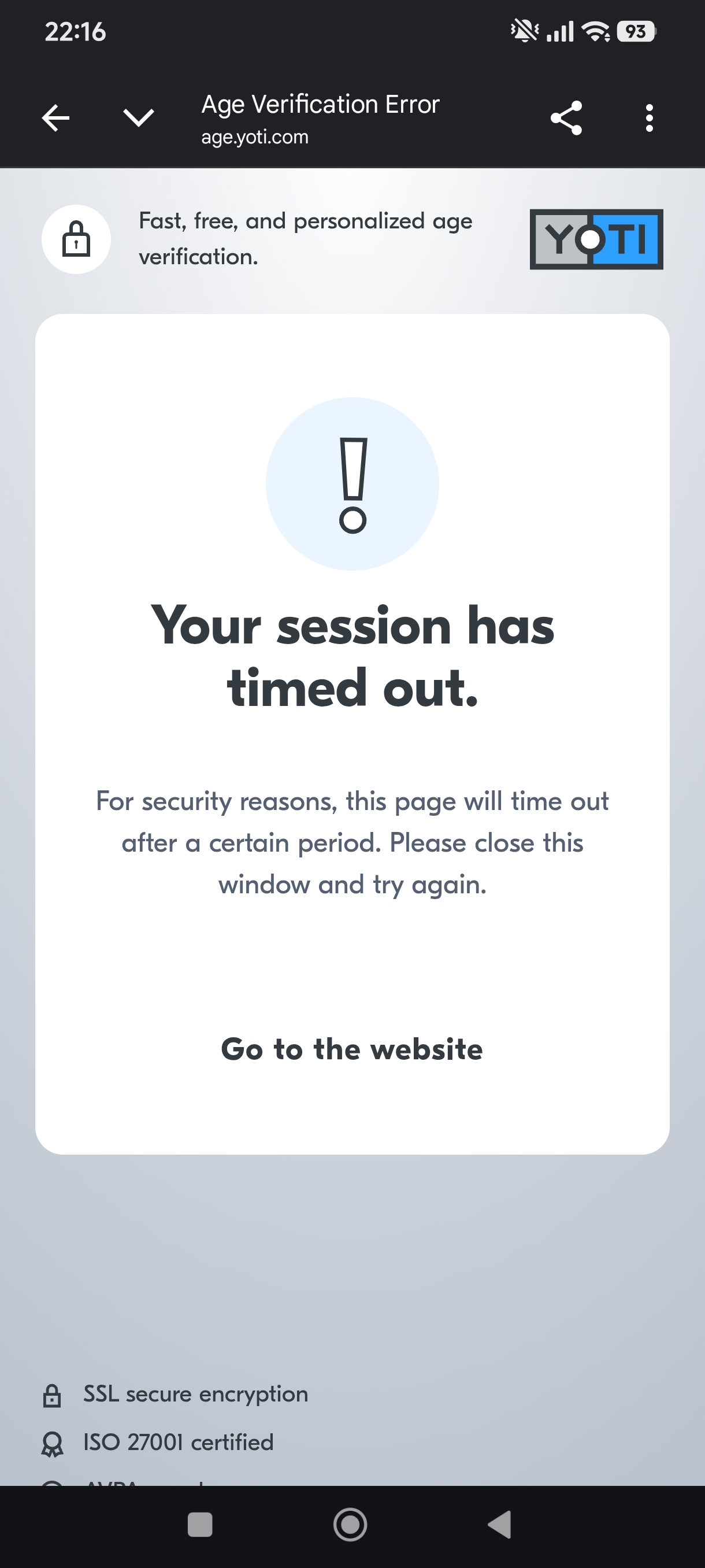 Every time you send me a Yoti verification link, it is already expired when I open it. I try immediately, without VPN, and on different browsers, but it always shows "session expired".