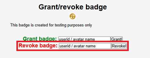 2. From the list of badges you have, click on the Grant/Revoke option for the badge you want to remove. This will take you to the Grant/Revoke page. Enter the User ID or the Avatar Name (@username) of the person from whom you want your badge removed.