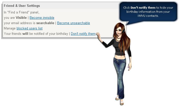 Who likes missed birthdays? Never forget your friend's birthday by using the Birthday Reminder functionality in IMVU. You will be notified of upcoming celebrations when you first login to the website or in IMVU Classic. You may also edit your birthday reminder setting if you do not want your friends to be reminded of your birthday. To edit the birthday reminder settings, follow the steps below:
