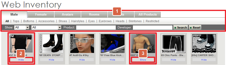 STEP 1. Click here to go to your IMVU Classic Website Inventory and look for the item that you wish to hide. The products you own can be filtered to make finding them easier.