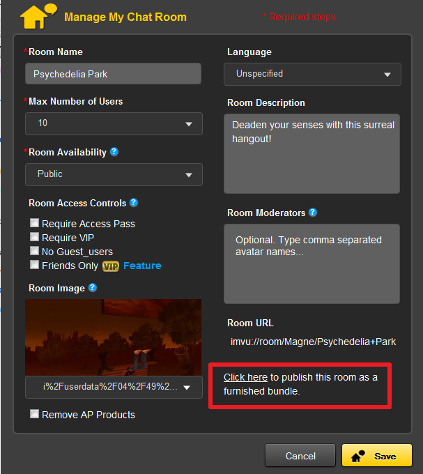 STEP 4: Fill up the required fields as would be normal in setting up a public room. Keep in mind that all the other fields are not visible in the Shop, except for the Room Shell that you choose. Afterwards, create your room.