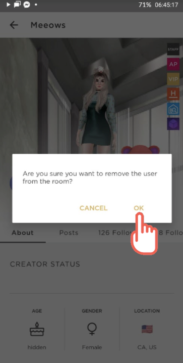 VIP Hosts can select Moderators to assist them in ensuring a positive and engaging experience in a Live Room. At any time, a VIP Host or a Moderator can remove another user following these simple steps.