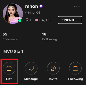 The gifting button is available on everyone’s profile card. Profile cards can be accessed by clicking on a user image via People Search or your Friends list. You can also access the profile card from avatars within a Chat room by clicking on the user’s image icon.
